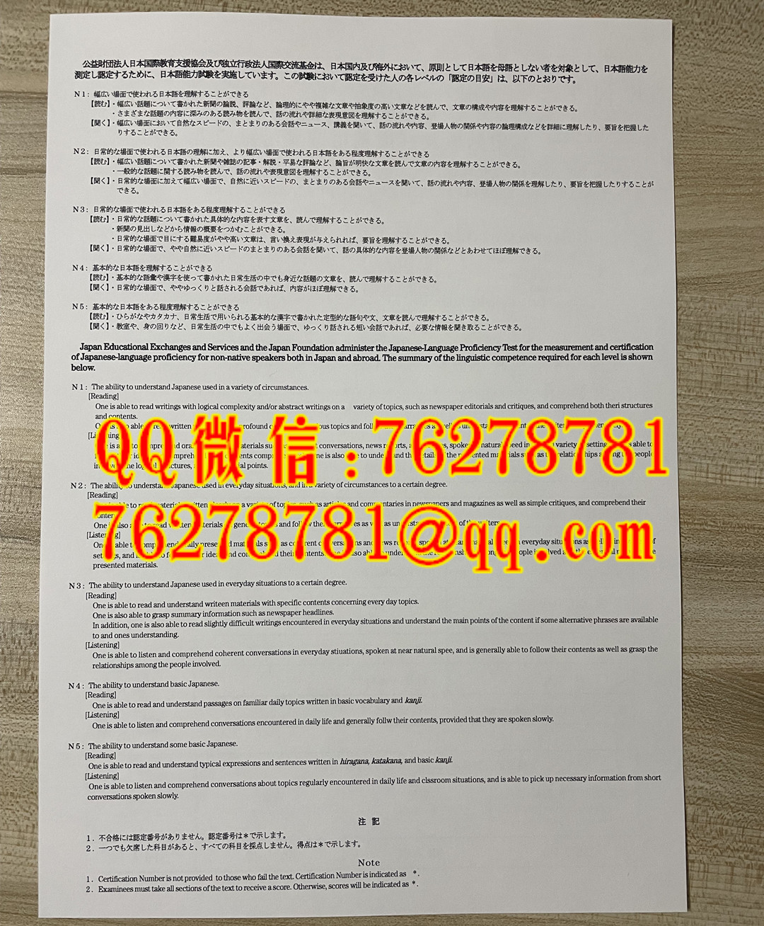 日本语能力测试(JLPT)N1 级的官方成绩与合格证书,日本語能力試験证书
